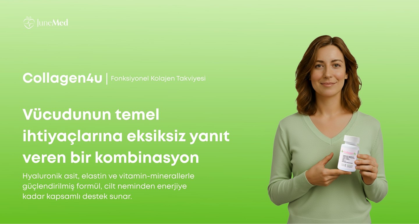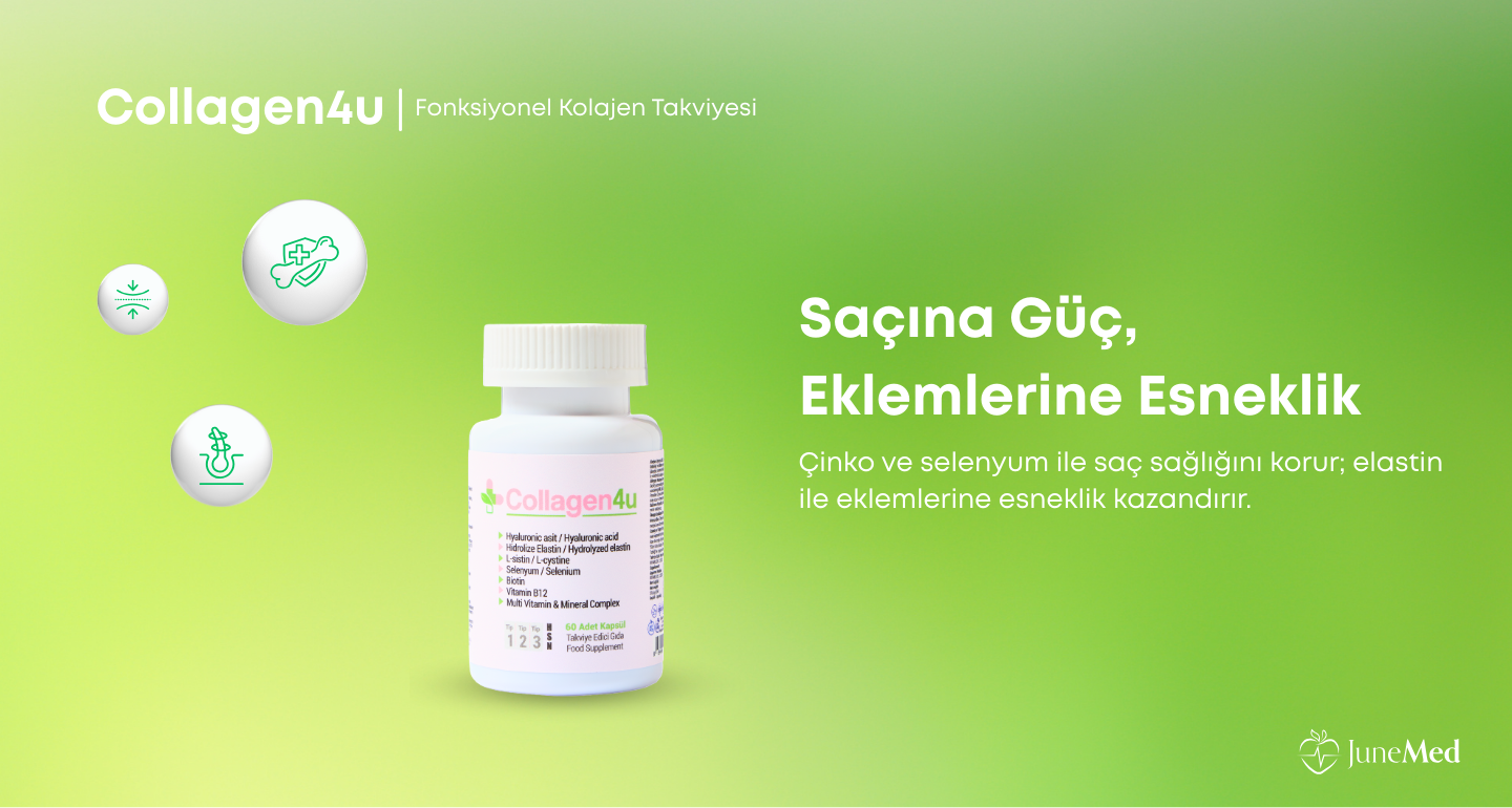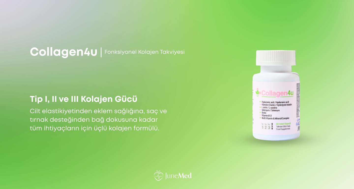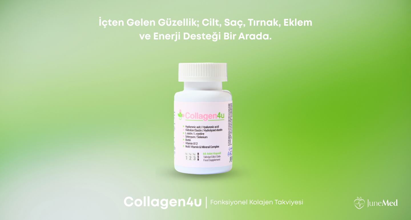 Collagen4u, cilt, saç, tırnak ve eklem sağlığını desteklemek üzere özel olarak formüle edilmiştir. İçeriğindeki Tip 1, 2 ve 3 kolajen peptitleri, hyaluronik asit ve elastin içeriği ile bağ dokularının normal fonksiyonuna, cilt elastikiyetine ve nemlendirilmesine katkıda bulunur. L-sistin, selenyum, çinko ve biotin gibi besin öğeleri saç ve tırnakların korunmasına yardımcı olur. B1, B2, B3, B5, B6 ve B12 vitaminleri enerji metabolizmasını desteklerken; demir ve folik asit yorgunluğun ve bitkinliğin azalmasına katkı sağlar. Bitkisel kapsül formundadır.